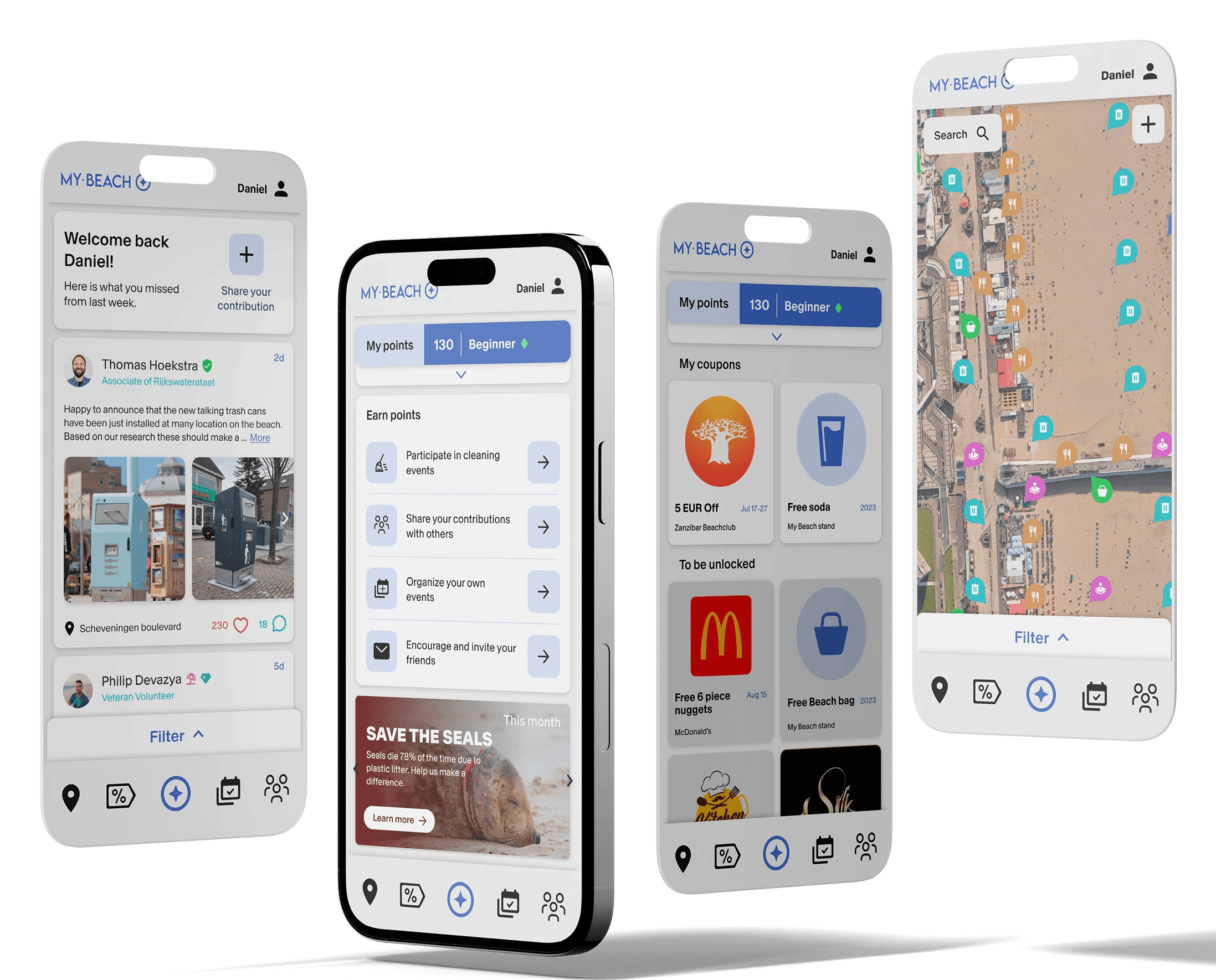For the initial prototypes, I focused on creating a testable base with four key pages: Map of the Beach, Discounts, Events, and Community. The user journey was carefully planned to ensure engagement: